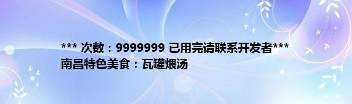 本文*** 次数:9999999 已用完请联系开发者*** 南昌特色美食:瓦罐煨汤到此分享完毕,希望对大家有所帮助。