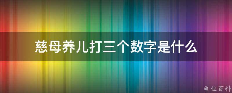 慈母养儿打三个数字是592,因为慈母中的母有5画,养9画,儿有2画,所以,慈母养儿打三个数字是592。在数字谐音中,0代表圆满、完美、无尽;1代表唯一、你、起点;2代表爱、两人世界;3代表想念、生命、生活;4代表是的、时时。