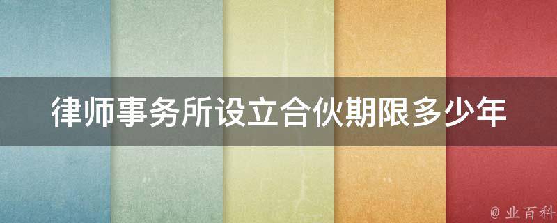 律师事务所设立合伙期限是三年,个人所是五年。律师法第十五条规定,设立合伙律师事务所,除应当符合本法第十四条规定的条件外,还应当有三名以上合伙人,设立人应当是具有三年以上执业经历的律师。合伙律师事务所可以采用普通合伙或者特殊的普通合伙形式设立。合伙律师事务所的合伙人按照合伙形式对该律师事务所的债务依法承担责任。