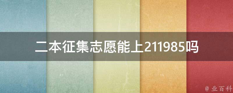 二本征集志愿不能上211和985院校。因为211和985院校一般不参与征集志愿,即使征集志愿中包含211和985院校,但参与征集志愿的大都是高分考生,竞争压力非常大,很难被录取。征集志愿是指参加高考志愿的院校招生计划没有录满,在录取完成之后,再次公布院校招生缺额计划,考生可以通过征集志愿,拥有第二次重新填报志愿的机会。