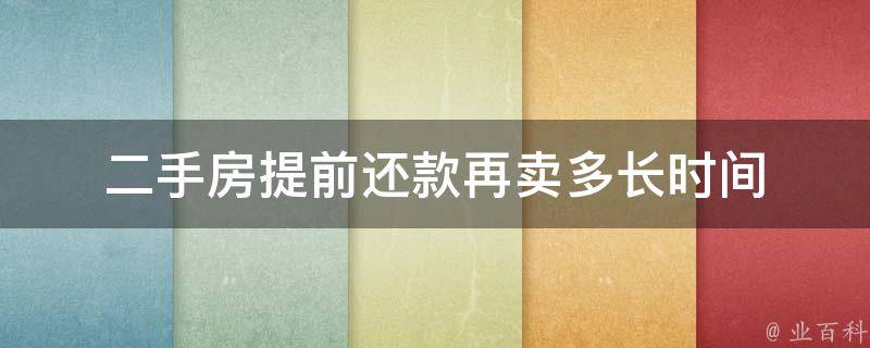 二手房贷款提前还款再卖的时间取决于不同银行、不同时期的预约时间,短的可能只需10几天,长的可能长达两三个月。二手房贷款提前还款需要借款人提前一个月向贷款行申请办理提前还款。银行需根据申请提前还款的人数以及办理业务的人力来决定预约时间。