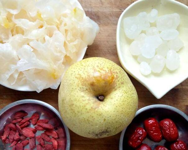 1、准备材料:梨250克、银耳、枸杞、大枣、冰糖适量。