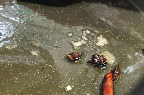 锅中热油,放入冰糖、八角、豆蔻翻炒,炒至糖微黄。