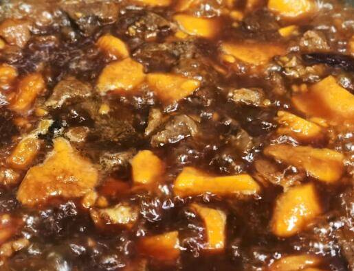 倒切块的红薯翻炒,将炒好的红薯牛肉倒入电压力锅,加水至快没过菜面,加少许生抽,电压力锅压40分钟。