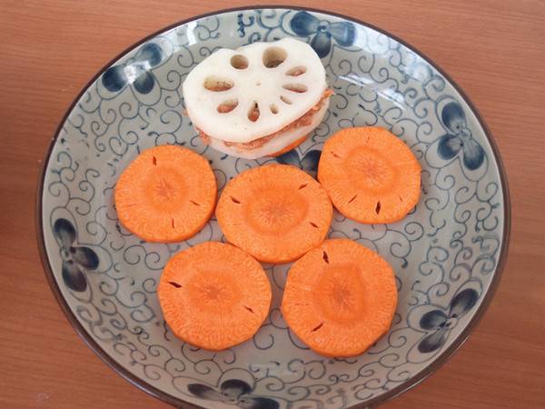 1、准备材料:藕夹6个、盐适量、白糖适量、 生抽适量、枸杞5克、胡萝卜50克。