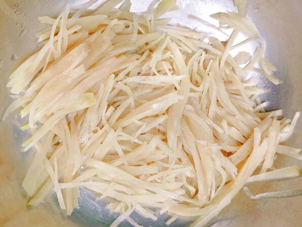 5.爆香蒜末、葱花,加入芥菜疙瘩翻炒均匀。