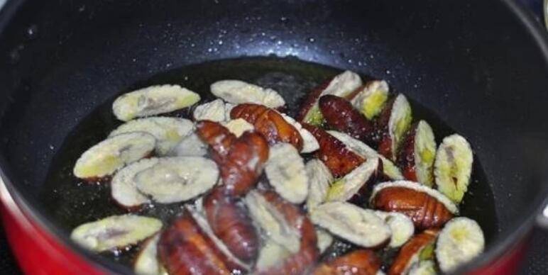 6、起锅倒油,油温八成热时下入蚕蛹滑油片刻后捞出控油。