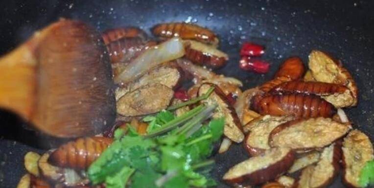 材料:蚕蛹200g、油适量、盐适量、花椒大料适量、干红椒适量、香菜适量、葱姜蒜适量、酱油适量、糖适量。