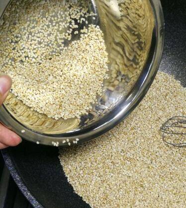 用小火一直不停的翻搅,当听到锅中不断有“啪啪啪”的声音时,芝麻的颜色也开始变黄,说明芝麻已经炒好。