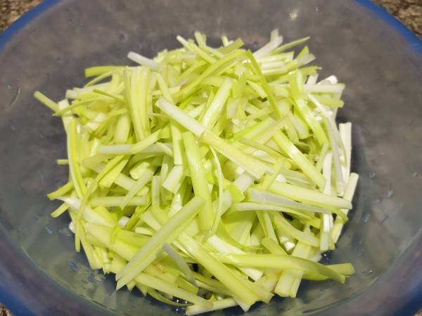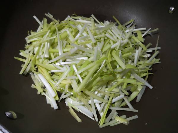 5、锅中重新热油,倒入韭黄翻炒。
