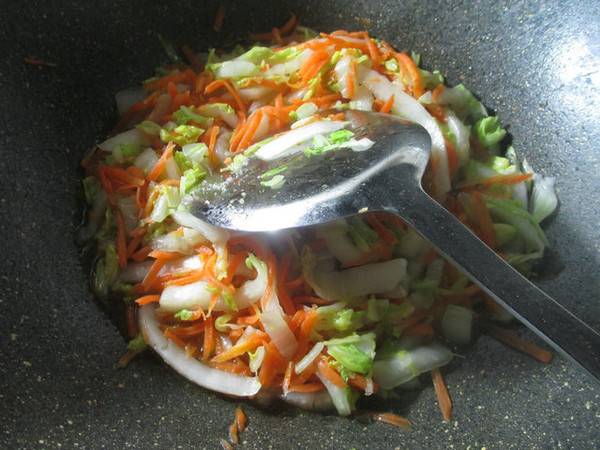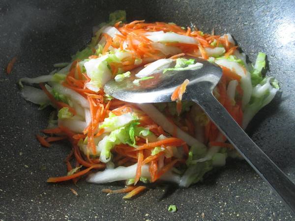 4、烧锅倒油烧热,下入切好的大白菜翻炒翻炒至断生。