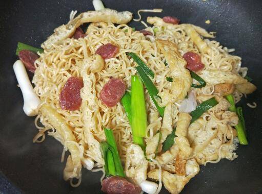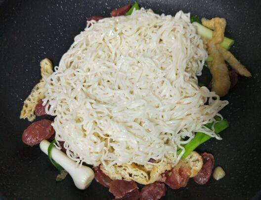 4、然后放入面条,腊肠继续翻炒。