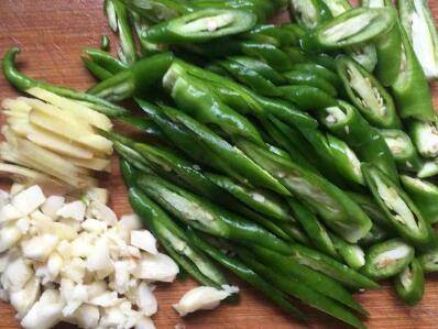 炖蹄筋期间,将辣椒切斜块,生姜、大蒜切碎备用。