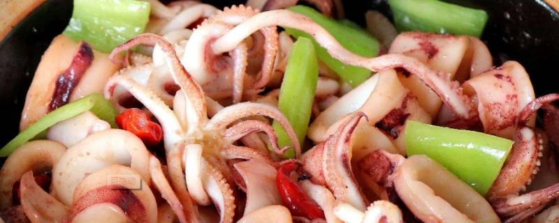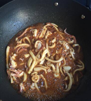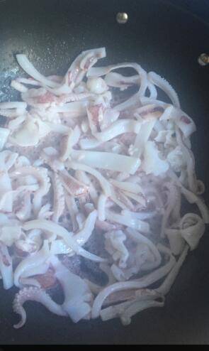 2、锅热,倒油,油温五成热的时候倒入鱿鱼,翻炒。