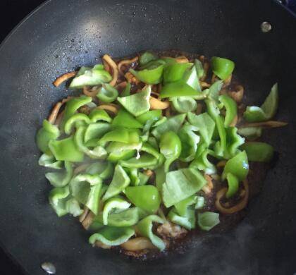 4、入青椒,翻炒。青椒炒熟后即可出锅。