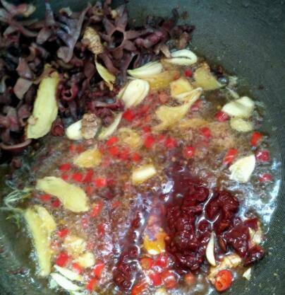 2、锅里放油烧热,放花椒、八角、干辣椒段,然后放郡肝爆炒,放点料酒去腥,把水分炒干。