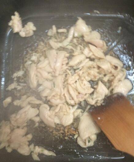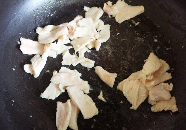 3、热锅放油,放入鸡胸肉小火炒至变色后盛出备用。