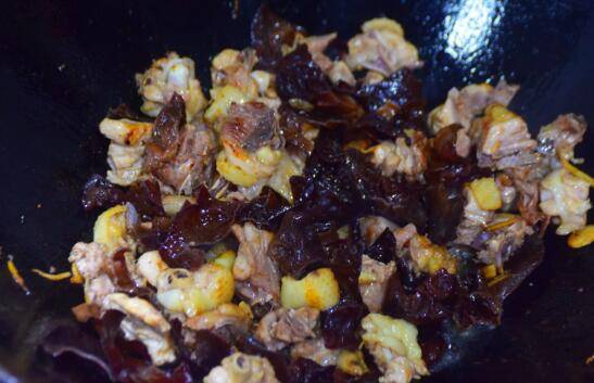 5、等鸡肉炒至表面焦黄之后,放入木耳,一起快速地爆炒2分钟,将木耳的水分炒干,再将调好的碗汁淋入锅中,翻炒均匀,再盖上锅盖,焖煮2分钟。