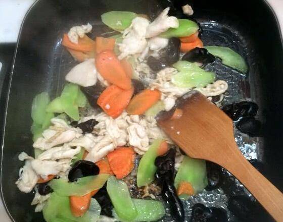 1、准备食材:鸡胸肉150g、莴笋半根、胡萝卜半根、泡发木耳一把、葱姜切末、蛋清1个、用于鸡肉上浆、淀粉少许、胡椒粉少许、盐、料酒、玉米油。