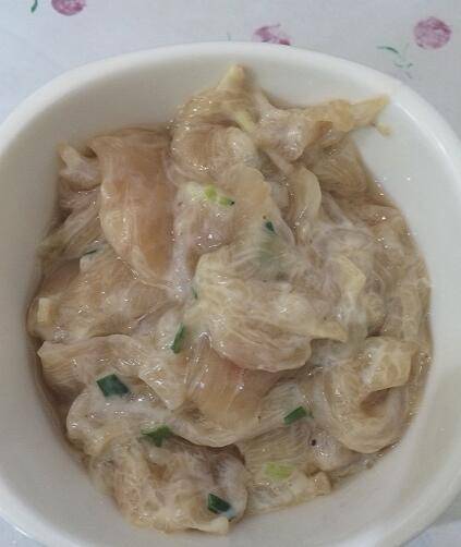 2、鸡胸肉切成薄片,加入葱姜末、少许料酒、一丁点盐、一小匙胡椒粉、一个蛋清、一小勺淀粉,筷子拌匀腌制半小时以上。