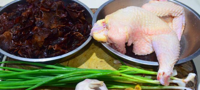 1、准备食材:土鸡、木耳120克、大蒜5瓣、小葱3根、生姜1块。在开始正式制作之前呢,我们首先需要准备以下食材,土鸡半只,干木耳120克,小葱3根,大蒜5瓣,生姜1块,食盐1茶匙,生抽2汤匙,蚝油2汤匙,淀粉2汤匙。
