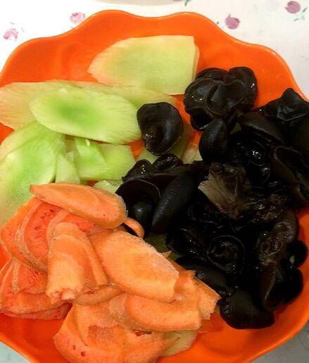 3、将莴笋和胡萝卜切片,木耳去蒂洗净备用。