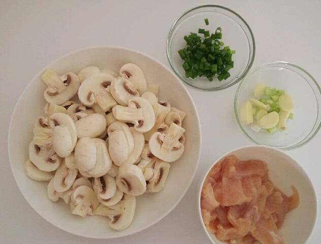 1、准备食材:口蘑300g、鸡胸肉100g、葱1根、蒜2瓣、油、盐、鸡精、生抽15ml、料酒8ml、淀粉。口蘑洗净,切片;鸡胸肉洗净切片,用盐、料酒和淀粉抓匀,腌制10分钟。