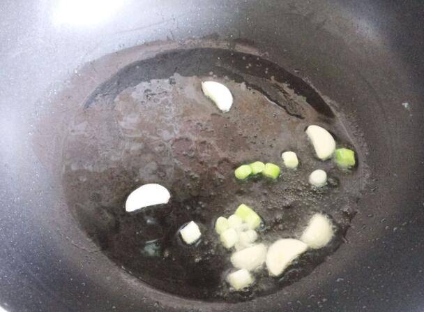 4、热锅放油,放入葱白和蒜片小火煸出香味。