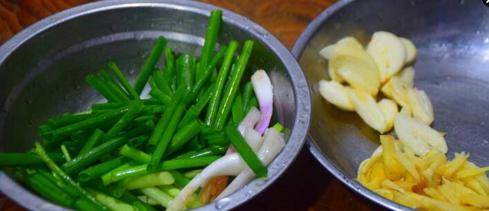 2、提前将木耳泡发洗净,然后切小块,装盘备用,再把大蒜切片,生姜切丝,一起装盘备用,最后把小葱切成寸段,也装盘备用。