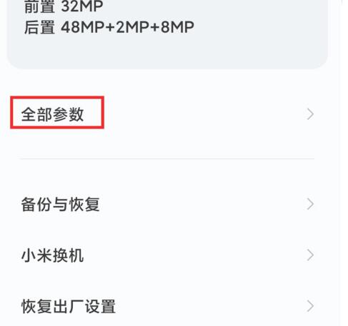4、我的设备可以查看关于手机的型号、分辨率、存储空间等各种信息,滑到下面点进“全部参数”。