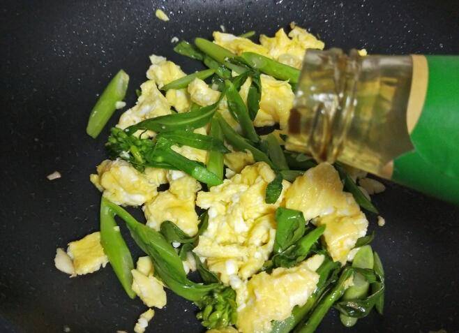 2.鸡蛋用油炒熟,然后盛出备用。