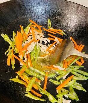 热锅放油,依次放入肉丝、四季豆、胡萝卜,煸炒出香味,加入适量盐调味,翻炒均匀。