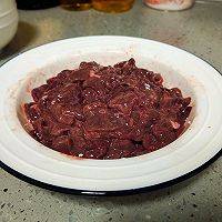 2、猪肝改刀切薄片,放入生粉、料酒。