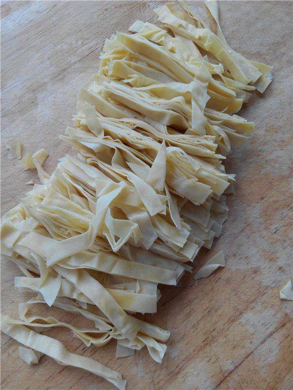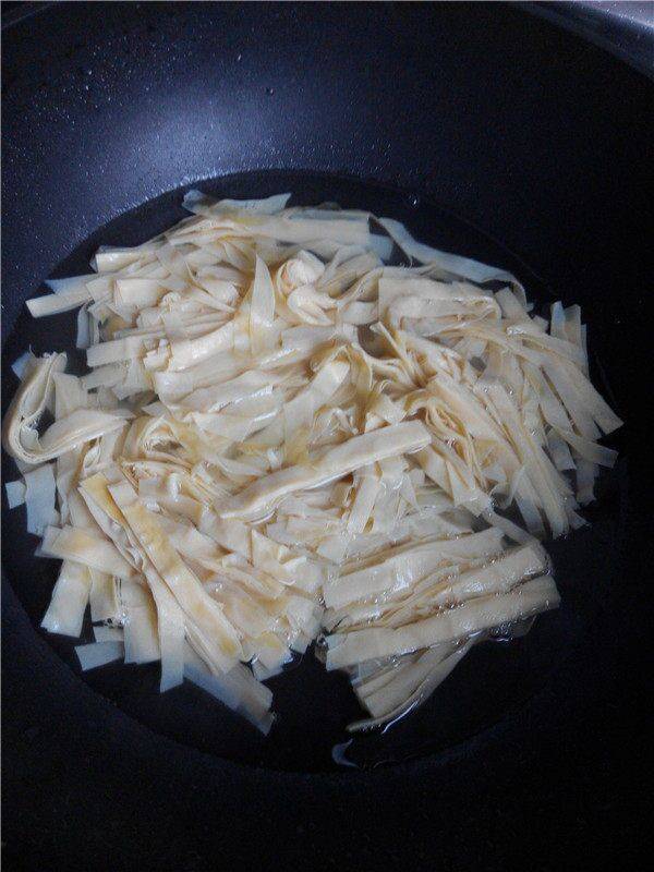 2、豆腐皮切成丝。