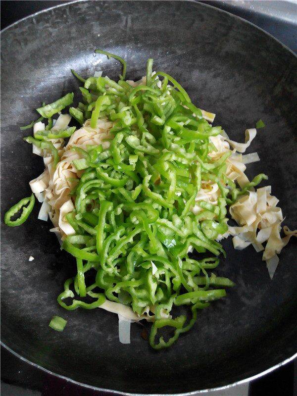 7、放入豆腐皮、尖椒翻炒均匀。
