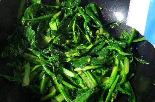 6、放入切好的芥兰叶,这样能保证杆和叶差不多同时熟,继续大火力翻炒3-5分钟。