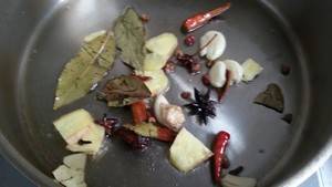 4、锅洗净后,热锅凉油放入姜、蒜、尖椒、花椒、八角、桂皮、丁香、香叶、小茴香。