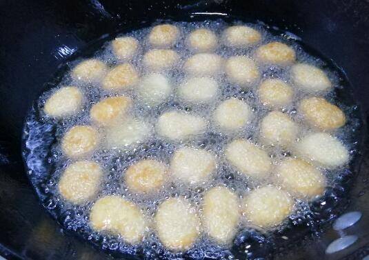 9、油热后放入搓好的芝麻球,大火炸。