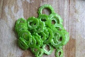 1、用筷子将苦瓜的瓤掏出,横切薄片。放清水加半茶匙盐浸泡10分钟去苦味。