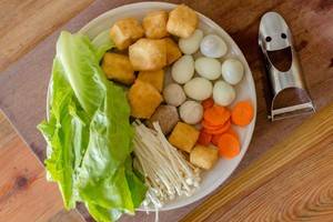 4、金针菇去根,洗净切两段,熟鹌鹑蛋剥壳,胡萝卜切片,生菜洗净,准备好豆腐泡和牛肉丸子。