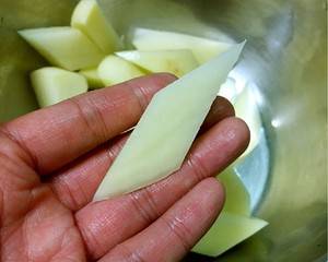 4、土豆去皮切长条后用清水洗去表面淀粉,控干。