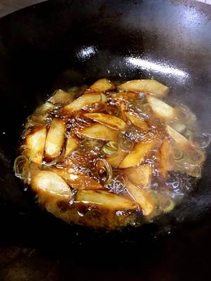 7、加入葱、姜、酱油和蚝油,加土豆翻炒均匀。