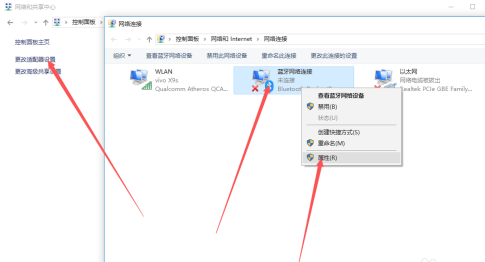 6、点击“更改适配器设置”,右键点击本地连接选项。选择属性。