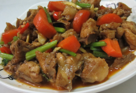 鸡和红萝卜切丁,姜切丝,芹菜切丝;