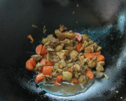 添加适量清水,将红萝卜和鸡丁焖香焖熟;