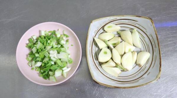 2、调味料准备好几棵小葱、一头大蒜、一盒红烧肉酱即可;没有这个酱可用适量酱油、生抽、红豆腐乳酱汁、盐、少许白糖等代替。