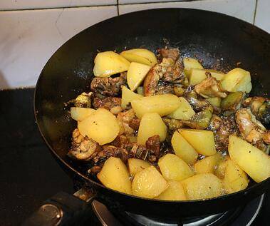 再加入土豆,食盐一起翻炒至土豆表面金黄色。