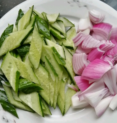 黄瓜1-2根、五花肉100克、洋葱半个、大蒜1瓣、姜5片、干辣椒3-5个、油适量、生抽10ml、老抽5ml、糖1克、胡椒粉少量、味精1克。