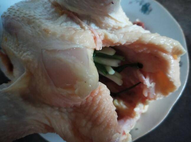 1、将鸡清洗干净,把小葱塞进鸡肚子里。