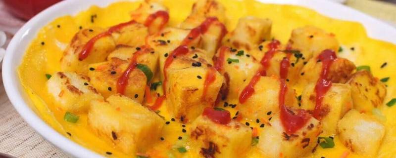2、把切好的馒头丁倒入蛋液中,让馒头裹满蛋液。